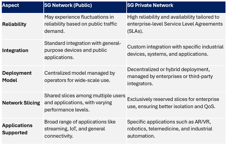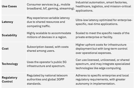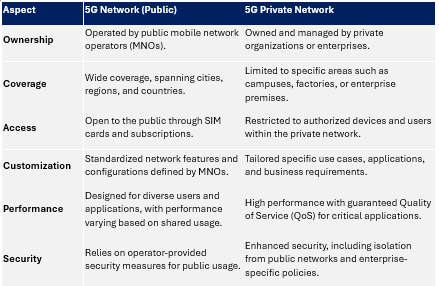 Below is a detailed table highlighting the operational, technical, and business distinctions between public and private 5G networks: