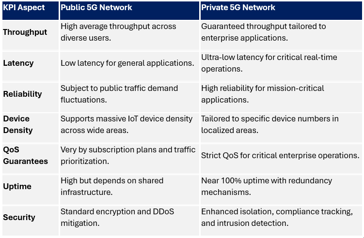 Private 5G networks often emphasize strict KPIs aligned with critical enterprise needs, while public networks cater to general use cases with variable performance.